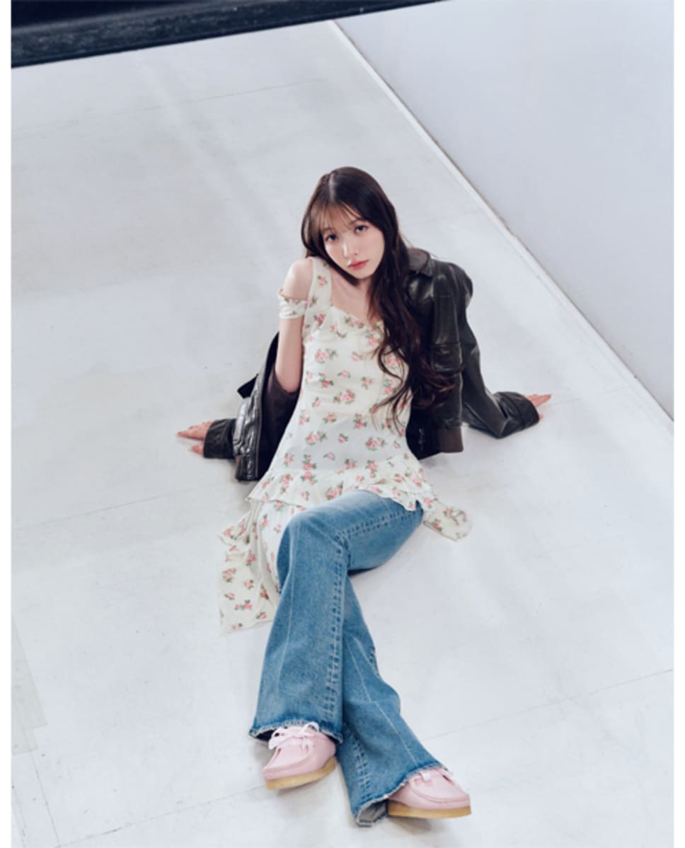 フリルワンピース¥57200/レイビームス 新宿(ユハン ワン) レザーブルゾン¥24970、フレアデニムパンツ¥18480/バロックジャパンリミテッド(MOUSSY) シューズ¥26400/クラークスジャパン(クラークス オリジナルズ) インナー/スタイリスト私物 ●商品情報はViVi2026年4月号のものです。