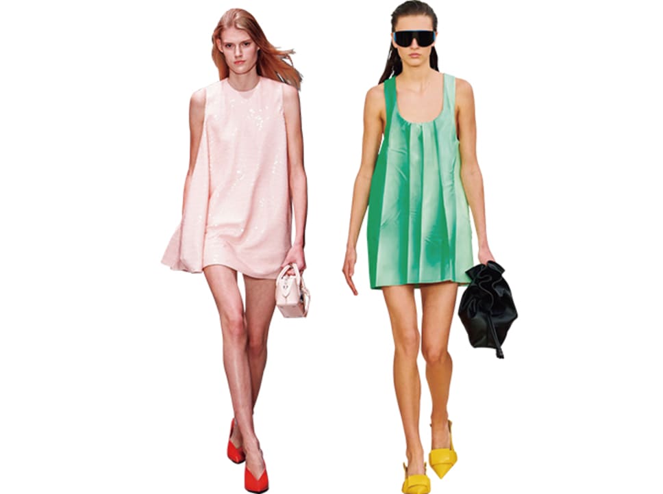 裾に向かって上品に広がるAラインシルエットが復権の予感。デザインはミニマムに、コーディネートは春夏らしいパステルのカラーブロックでフレッシュにまとめるのが今っぽい。