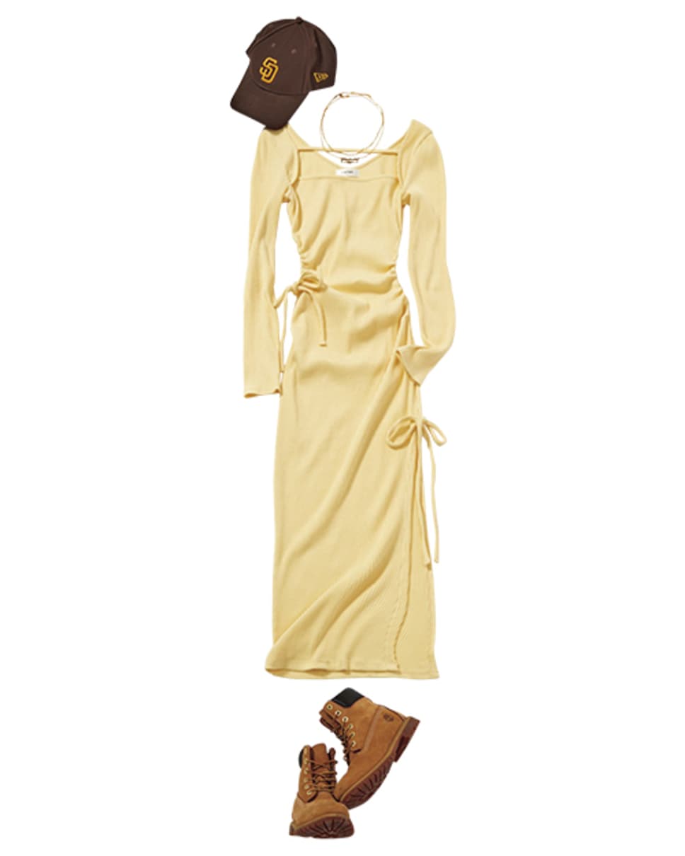 タイトワンピース¥14300/EATME 新宿ルミネエスト店 キャップ¥4620/ニューエラ ロゴネックレス¥13200、チェーンネックレス¥9200/805 showroom(89xiiitokyo) ブーツ¥30800/VFジャパン(ティンバーランド) ●商品情報はViVi2026年4月号のものです。