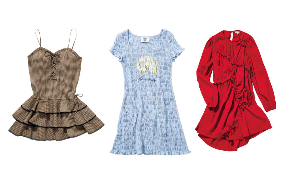 【左】フリルキャミワンピース¥8690/EMODAルミネエスト新宿店 【中央】シャーリングワンピース¥9900/jóuetieルミネエスト新宿店 【右】ワンピース¥25080/ザ・ウォールショールーム(ゴスペル) ●商品情報はViVi2026年4月号のものです。