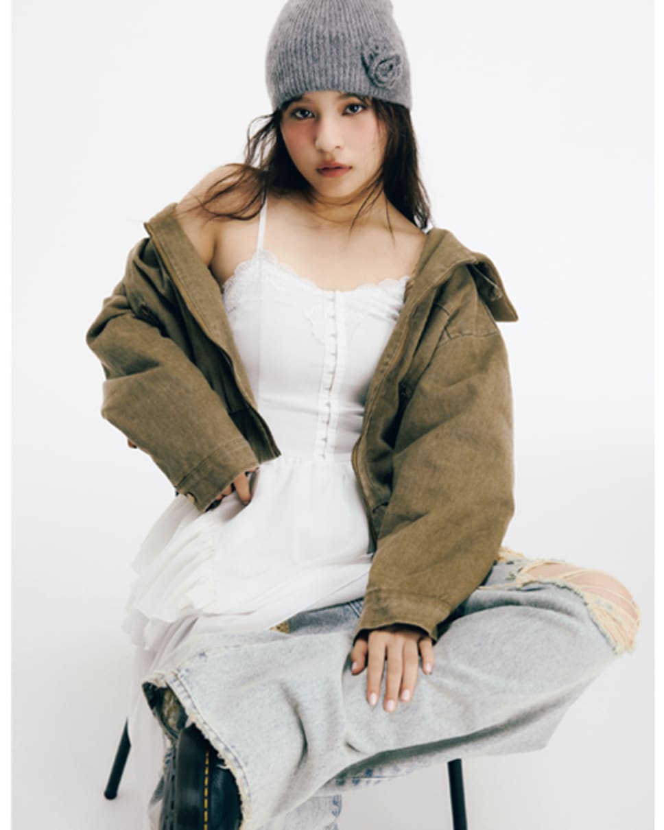 ランジェリーキャミワンピ¥12200/EVRISルミネエスト新宿 ブルゾン¥13200/アンティローザ(SHAGGIE) デニムパンツ¥14080/EMODAルミネエスト新宿店 ビーニー¥3790/NADIAFLORES EN EL CORAZONシューズ¥28600/ドクターマーチン・エアウエア ジャパン(Dr.Martens) ●商品情報はViVi2026年4月号のものです。
