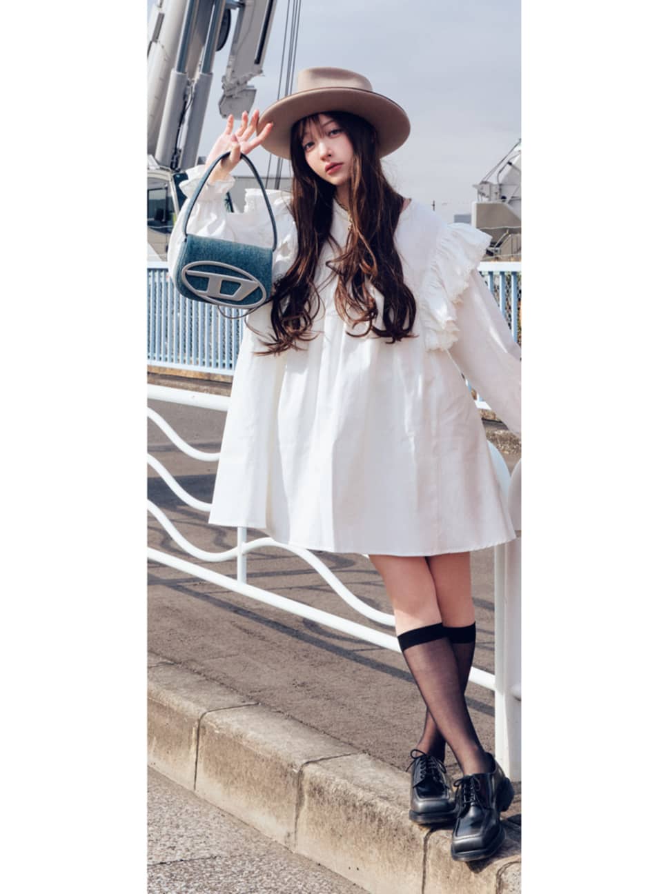 ワンピース¥22880/ザ・ウォール ショールーム(シスタージェーン) ハット¥46200/CA4LAプレスルーム(CA4LA Atelier Made) ネックレス¥16500/Bijou R.I バッグ¥69300/DIESEL JAPAN(DIESEL) シアーソックス¥1210/タビオ(靴下屋) シューズ¥30800/ドクターマーチン・エアウエアジャパン(Dr.Martens) ●商品情報はViVi2026年4月号のものです。