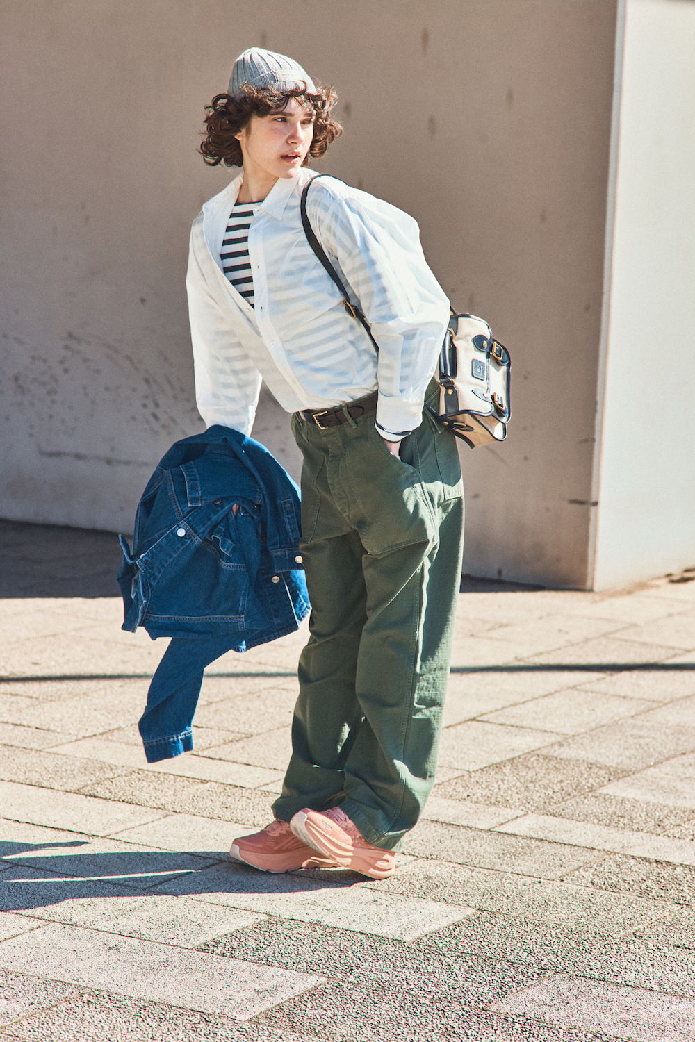 シャツ¥18920/MidiUmi(マザーズインダストリー)、カットソー¥14300/Véritécoeur(ヴェリテクール)、パンツ¥32780/FULLCOUNT(フルカウント)、手に持ったジャケット¥15900/Gap(ギャップ)、キャップ¥4950/SANDINISTA(トゥー・ステップ)、ベルト¥20900/Scye(マスターピースショールーム)、バッグ¥59400/GLENROYAL(ブリテッシュメイド 青山本店)