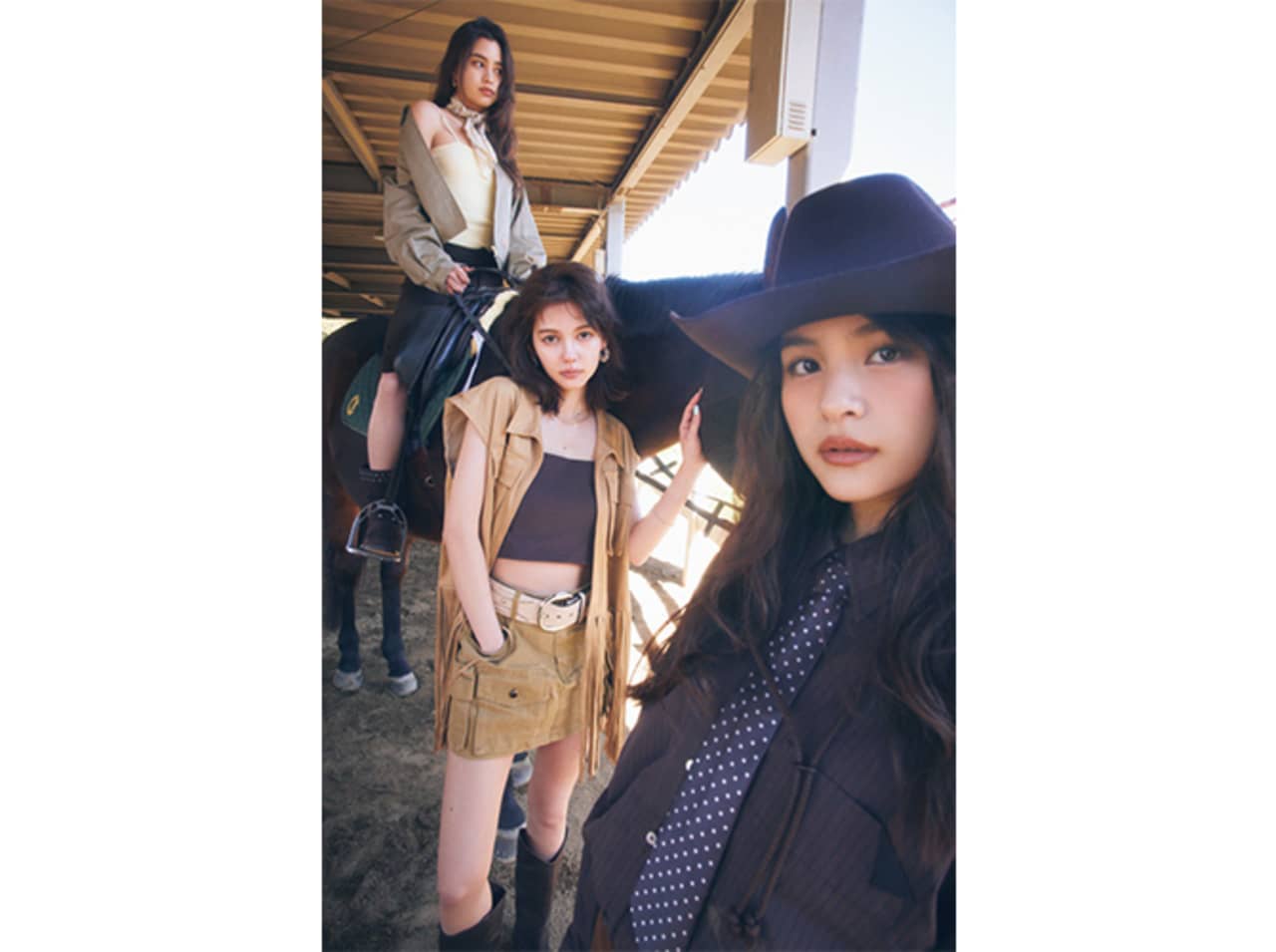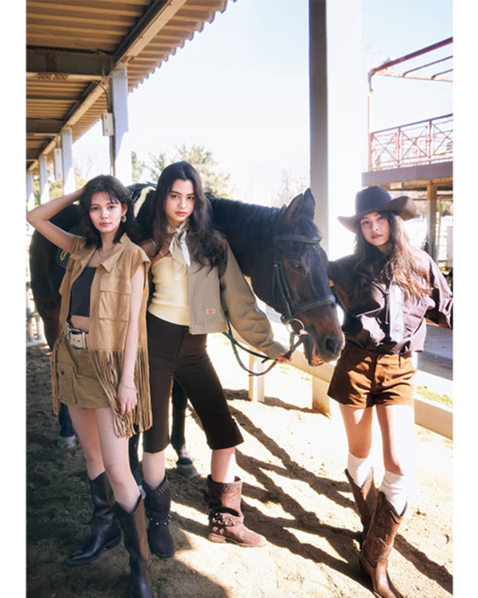 【左・エリカ】ベスト¥15400/Ungrid キャミソール¥3850/バロックジャパンリミテッド(THROW bySLY) ミニスカート¥5830、ベルト¥3960/アンティローザ(SHAGGIE) ピアス¥14300、ネックレス¥40700、ブレスレット¥27500/Bijou R.I ウエスタンブーツ¥19990/ザラ カスタマーサービス(ザラ) 【中央・ユナ】ジャケット¥13200/エドウイン(ディッキーズ) キャミソール(カーディガンとセット)¥10989(SLY)、バンダナ¥5500(MOUSSY)/バロックジャパンリミテッド カプリパンツ¥5390/アンティローザ(SHAGGIE) ネックレス(2点セット)¥2640/GOLDY ブーツ¥17990/ザラ カスタマーサービス(ザラ) 【右・コハナ】ネクタイ付きシャツ¥19800/メゾンスペシャル 青山店(メゾンスペシャル) ショートパンツ¥10450/バロックジャパンリミテッド(MOUSSY) ハット¥19250/CA4LA プレスルーム(CA4LA) ソックス¥1540/タビオ(靴下屋) ウエスタンブーツ¥22990/ザラ カスタマーサービス(ザラ) ●商品情報はViVi2026年6月号のものです。