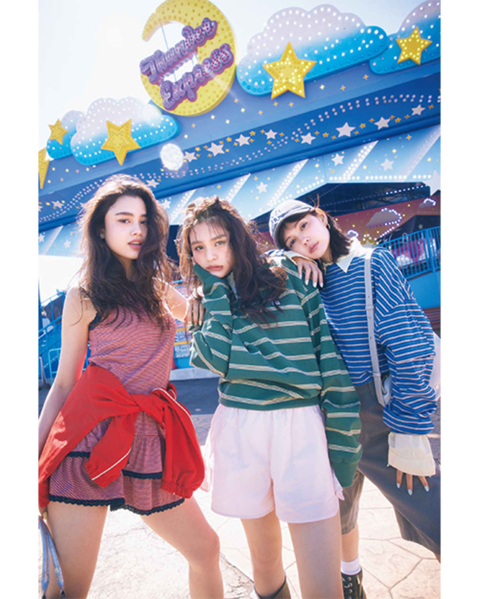 【左・ユナ】タンクトップ¥5940、スカート¥7920/jóuetie ルミネエスト新宿店 腰に巻いたトラックジャケット¥6999/H&M カスタマーサービス(H&M) イヤリング¥3850、バッグ¥9900/バロックジャパンリミテッド(SLY) ソックス¥990/タビオ(靴下屋) ブーツ¥30800/VF ジャパン(Timberland) 【中央・コハナ】ポロシャツ¥9350/グレースインターナショナル(RUSSELL ATHLETIC) ショートパンツ¥17600/マルディメクルディジャパン(マルディメクルディ) ブーツ¥16280/EMODA ルミネエスト新宿店 【右・エリカ】ロンT¥8998/バロックジャパンリミテッド(SLY) 中に着ているシャツ¥5990/ザラ カスタマーサービス(ザラ) ハーフパンツ¥13200/エドウイン(ディッキーズ) キャップ¥4400/フォーティーセブン ピアス¥13200/Bijou R.I バッグ¥10386/HANA SHOWROOM(mucu andebony) ソックス¥990/タビオ(靴下屋) ブーツ¥9790/R&E ●商品情報はViVi2026年6月号のものです。
