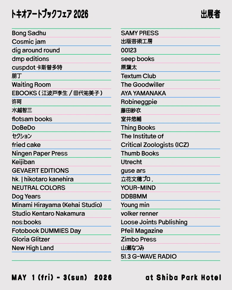 *Bong Sadhu(Japan)+ Cosmic jam(Japan)+ dig around round(Japan) / *dmp editions(Taiwan)+ cuspdot 卡斯普多特(China)+ pon ding 朋丁(Taiwan)+ Waiting Room(Taiwan) / *EBOOKS(江波戸李生 / 田代祐美子)(Japan)+ 许珂(China)+ 水越智三(Japan) / *flotsam books(Japan)+ DoBeDo(United Kingdom)+ セクション(Japan) / *fried cake(Japan)+ Ningen Paper Press(South Korea) / *Keijiban(Japan)+ GEVAERT EDITIONS(Belgium)+ hk. | hikotaro kanehira(Japan) / *NEUTRAL COLORS(Japan)+ Dog Years(Japan)+ Minami Hirayama (Kehai Studio)(Denmark)+ Studio Kentaro Nakamura(Japan) / *nos:books(Taiwan)+ Fotobook DUMMIES Day(Taiwan)+ Gloria Glitzer & we make it(Germany)+ New High Land(Taiwan / USA) / *SAMY PRESS(Japan)+ 出版芸術工房(Japan)+ 00123(Malaysia) / *seep books(Japan)+ 原葉太(Japan)+ Textum Club(Japan) / *The Goodwiller(Japan)+ AYA YAMANAKA(Japan)+ Robineggpie(South Korea)+ 藤田紗衣(Japan)+ 室井悠輔(Japan) / *Thing Books(Singapore)+ The Institute of Critical Zoologists (ICZ)(Singapore)+ Thumb Books(Singapore) / *UTRECHT(Japan)+ guse ars(Japan)+ 立花文穂プロ.(Japan) / *YOUR-MIND(South Korea)+ DDBBMM(South Korea)+ Young min(South Korea) / *volker renner(Germany)+ Loose Joints Publishing(United Kingdom / France)+ Pfeil Magazine(Germany) / *Zimbo Press(Japan)+ Natsumi Yamase(Japan)+ 51.3 G-WAVE RADIO(Japan)