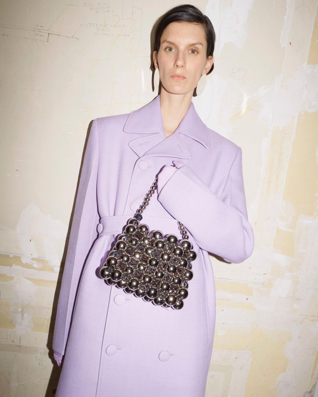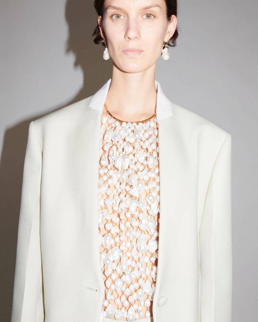 例えば、かっちりとしたテーラードジャケットにはたくさんの天然真珠で作られた胸飾りやレースの装飾を加えたスリップドレスを合わせたり、クリーンなAラインスカートに着心地のいいニットのボディスーツを合わせたり。ウエスト部分をニットで切り替えたドレスもある。
