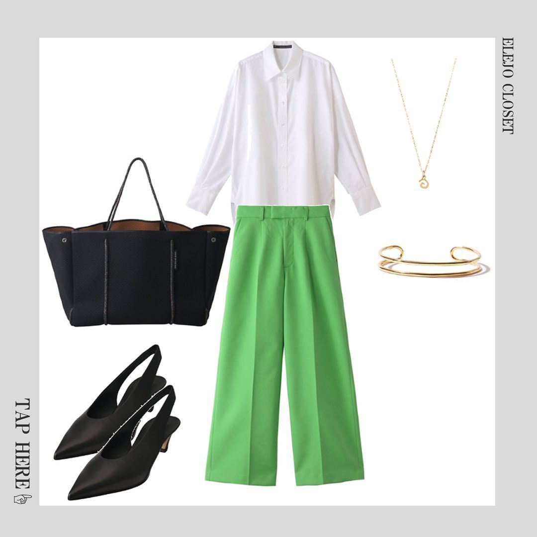 カーリーの着こなしを参考に、オーセンティックな白シャツと、目にも鮮やかなグリーンのパンツをセレクト。バッグ&パンプスもブラックを選んで、オフィスルックにもOKなきちんと感のある雰囲気に仕上げました。バングルをモードなアクセントにするべく、白シャツはちょっぴりロールアップして着こなすのが◎。