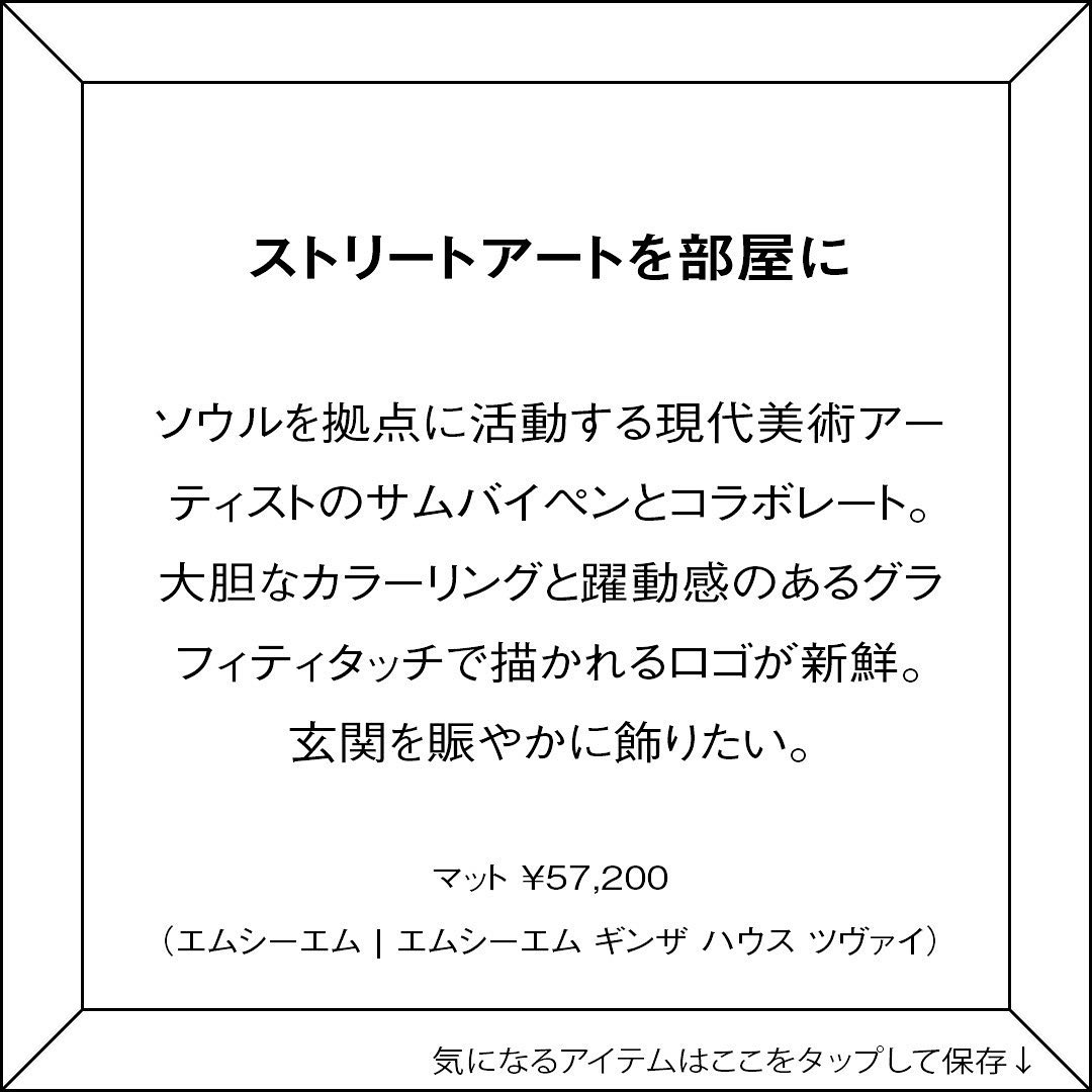 ソウルを拠点に活動する現代美術アーティストのサムバイペンとコラボレート。大胆なカラーリングと躍動感のあるグラフィティタッチで描かれるロゴが新鮮。玄関を賑やかに飾りたい。マット ¥57,200(エムシーエム | エムシーエム ギンザ ハウス ツヴァイ)