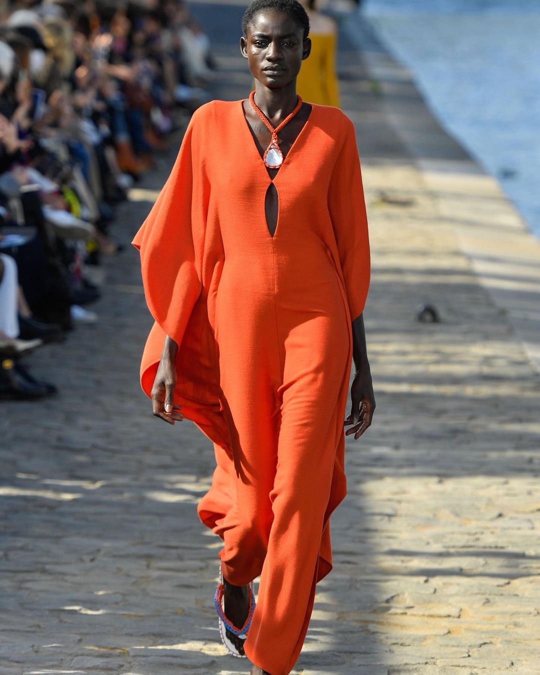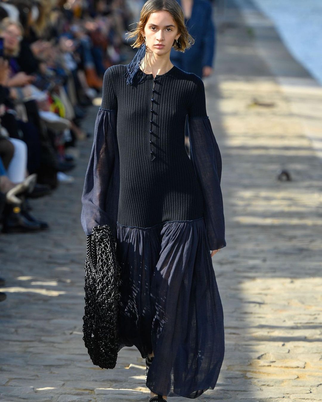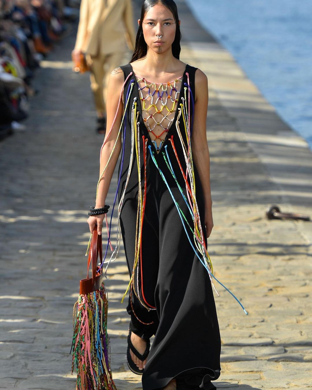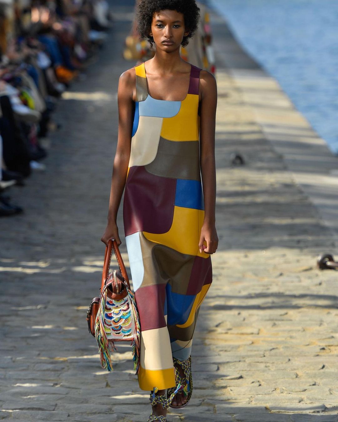 パリコレクション・ポート:「クロエ」の会場は、ノートルダム大聖堂を見渡せるセーヌ川沿い。お天気にも恵まれ、心地よい風が吹き抜ける中で、ブランドらしい優しいカラーパレットにガブリエラ・ハースト(Gabriela Hearst)が持ち込んだハンドクラフトへの愛が溶け合うウエアやアクセサリーを披露しました。ガブリエラは、「ラグジュアリーファッションは産業化されすぎた」という考えから、インディペンデントな職人の手で作られるアイテムに注力。例えば、過去のコレクションの残反を細かく切ってマクラメ編みで仕上げたドレスや、スエードのピースを組み込んで編んだクロシェニット、カラフルなテープ状のフリンジが風になびくドレスが目を引きます。
