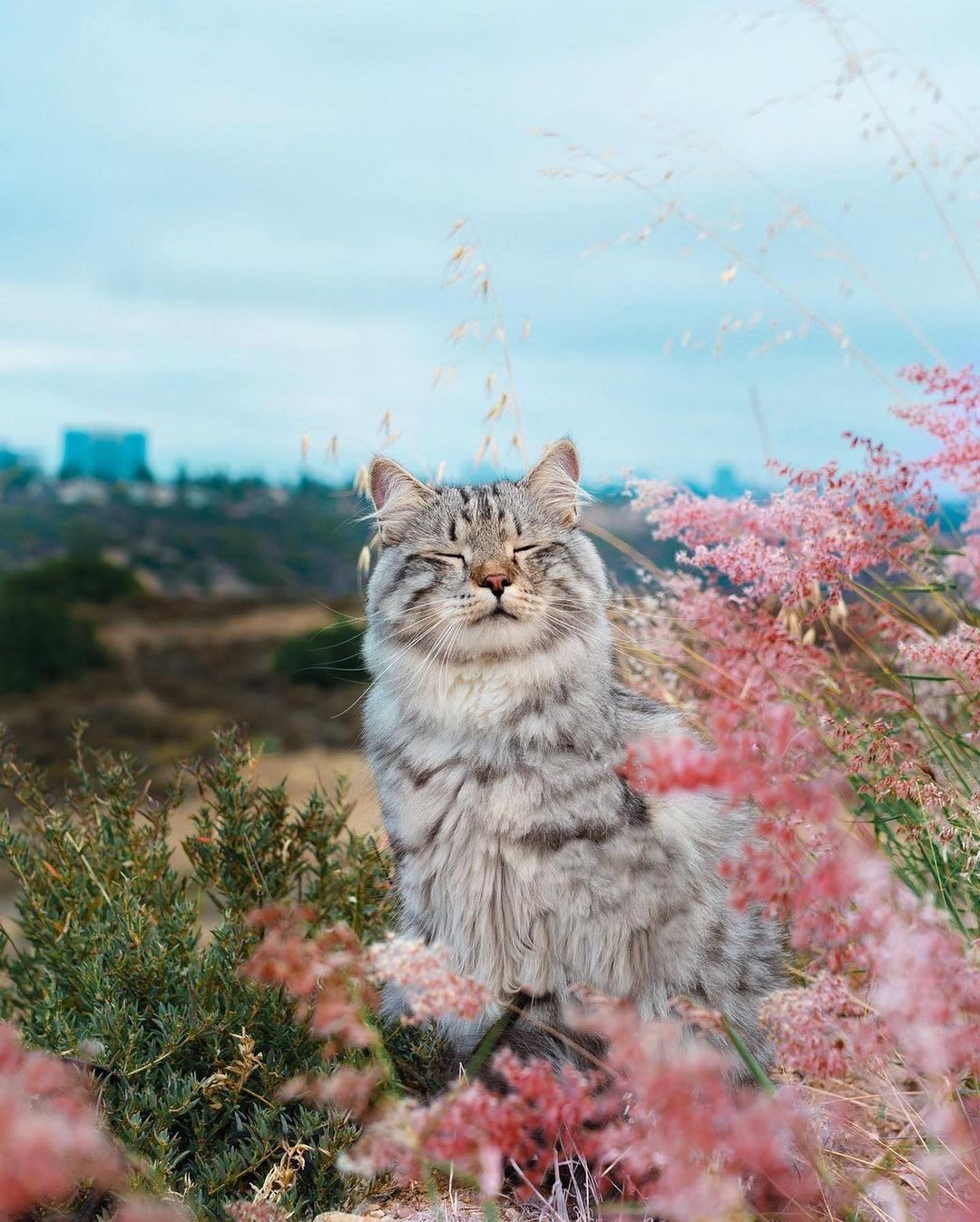 世界中を旅して綺麗な景色をシェアしているインスタグラマー、サイベリアンのスターリング🐈✈️大自然の気持ちよさに思わず目をつぶって自分の世界に入っている(?)スターリングの愛らしい姿をお届け❣️
