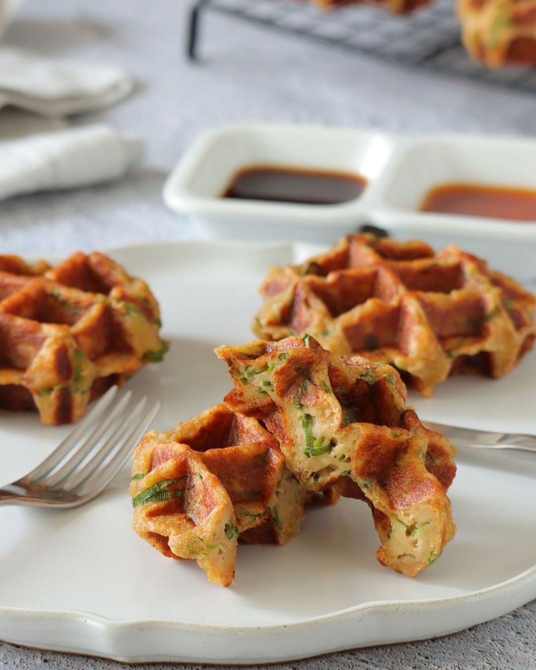 【#ワッフルレシピ 🧇】捨ててしまいがちな長ねぎの青い部分や残った食パン、冷蔵庫で眠っている五香粉やオイスターソースを活用して、台湾屋台の人気メニュー「葱油餅」をワッフルに🇹🇼外はカリッ、なかはもっちり!少しスパイシーな味わいは、おつまみにもおすすめ✨
