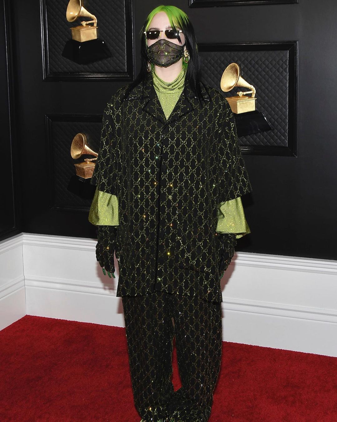 これまででもっとも印象的なルックの一つは、20年の「グラミー賞(Grammy Awards)」授賞式での全身「グッチ」でまとめたスタイル。ライムグリーンのスパンコールが輝くタートルネックトップに、黒と緑のラインストーンがあしらわれたオーバーサイズのシャツジャケットとパンツを合わせた。指なしの手袋を合わせ、グリーンの長い爪をアピール。メッシュのフェイスマスクで仕上げた。