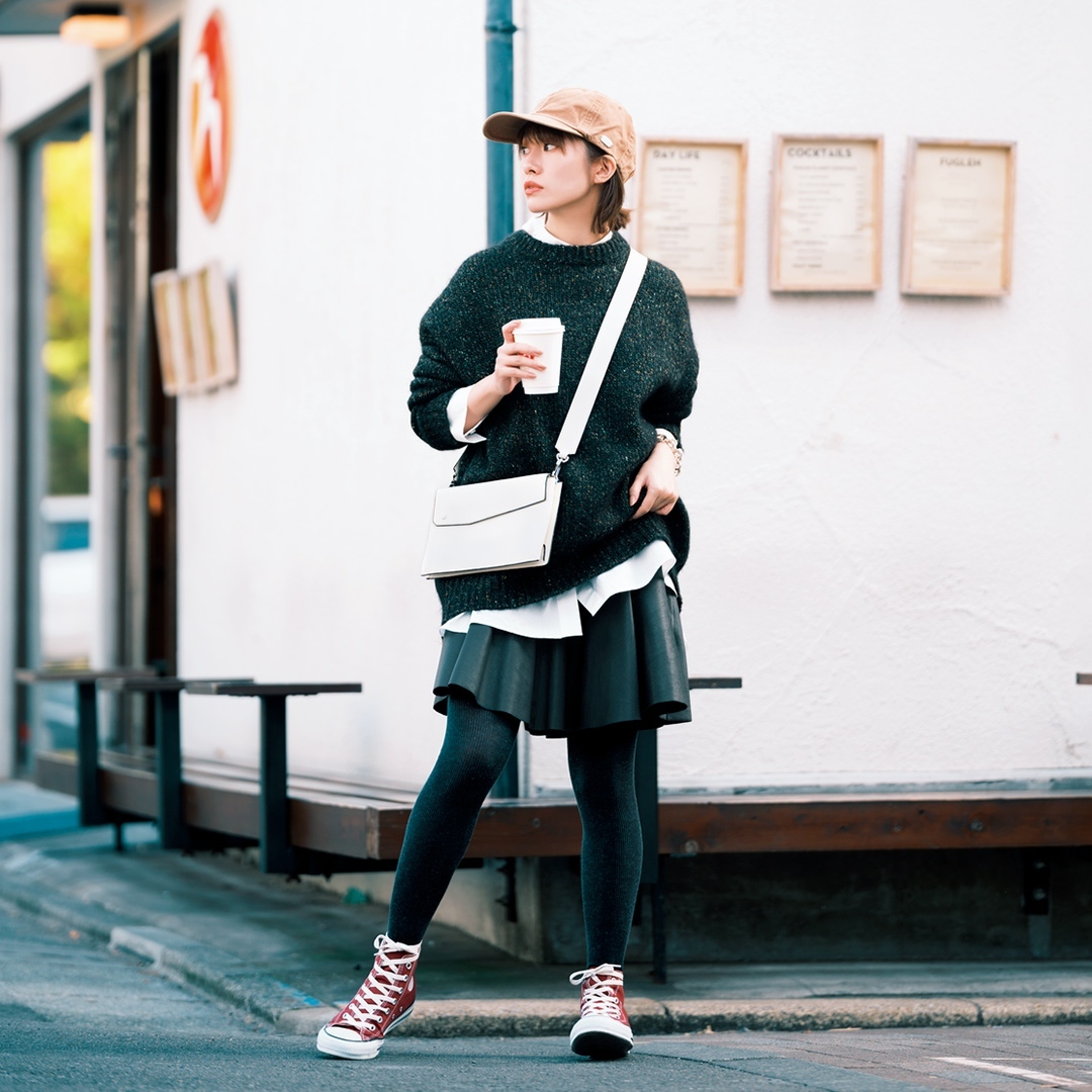 スカート¥60,500(THIRD MAGAZINE)タイツ¥1,430(フランティカ バイ フクスケ/福助)ニット¥36,300(サクラ/インターリブ)シャツ¥12,980(インディヴィ)バッグ¥305,800(ヴァレクストラ/ヴァレクストラ ジャパン)帽子¥8,140(CA4LA/CA4LA プレスルーム)ブレスレット¥36,960(パズコレクティブ/ZUTTOHOLIC)スニーカー¥6,380(コンバース/コンバースインフォメーションセンター)