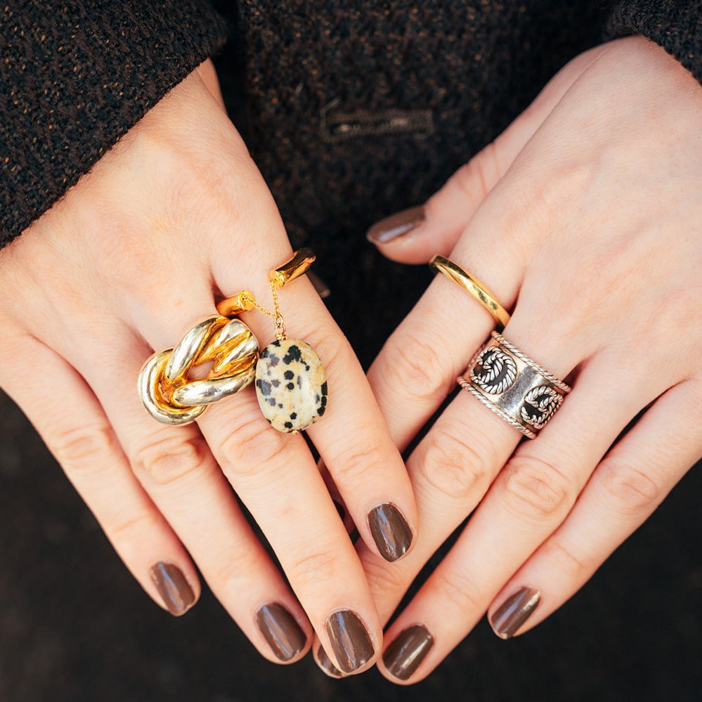 街のみんなは、コートの重量感に負けないくらいのボリューミーな手元が気分。冬は定番のシルバー派が多数かと思いきや、ゴールドやカラーストーンを合わせて、細部までブラッシュアップする人がたくさん。一本の指に重ねづけするテクニックも見逃せない。