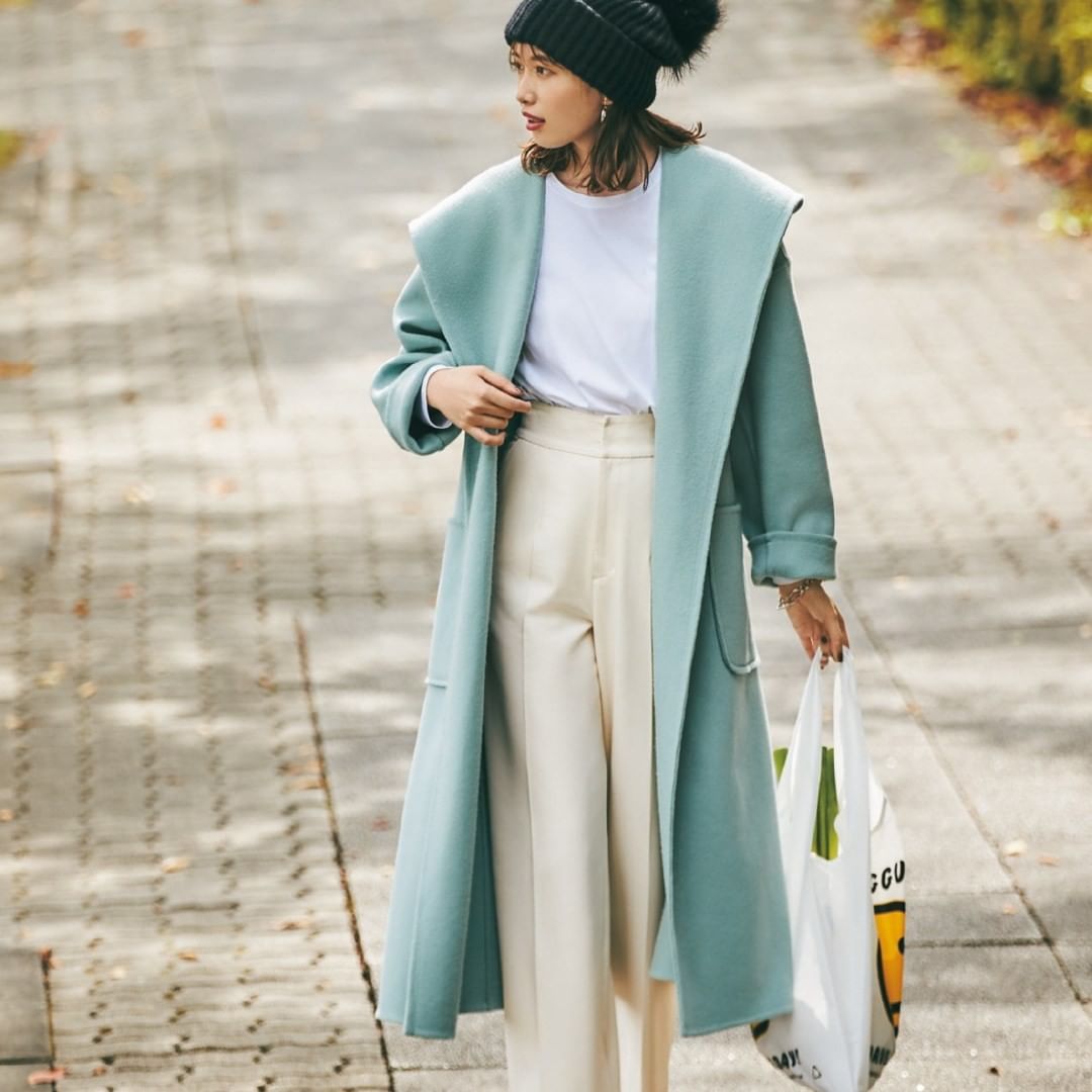 休日のリラックススタイルは、ロンT×きれいめウエストゴムパンツで。白やオフホワイトでワントーンに仕上げると今っぽい。外出するときは、きれい色のコートで鮮度を上げて。フード付きのガウンコートなら、リラクシーなムードも満点に。仕上げにニットキャップでちょっぴり外して、遊び心を加えるとさらにしゃれ感アップ。