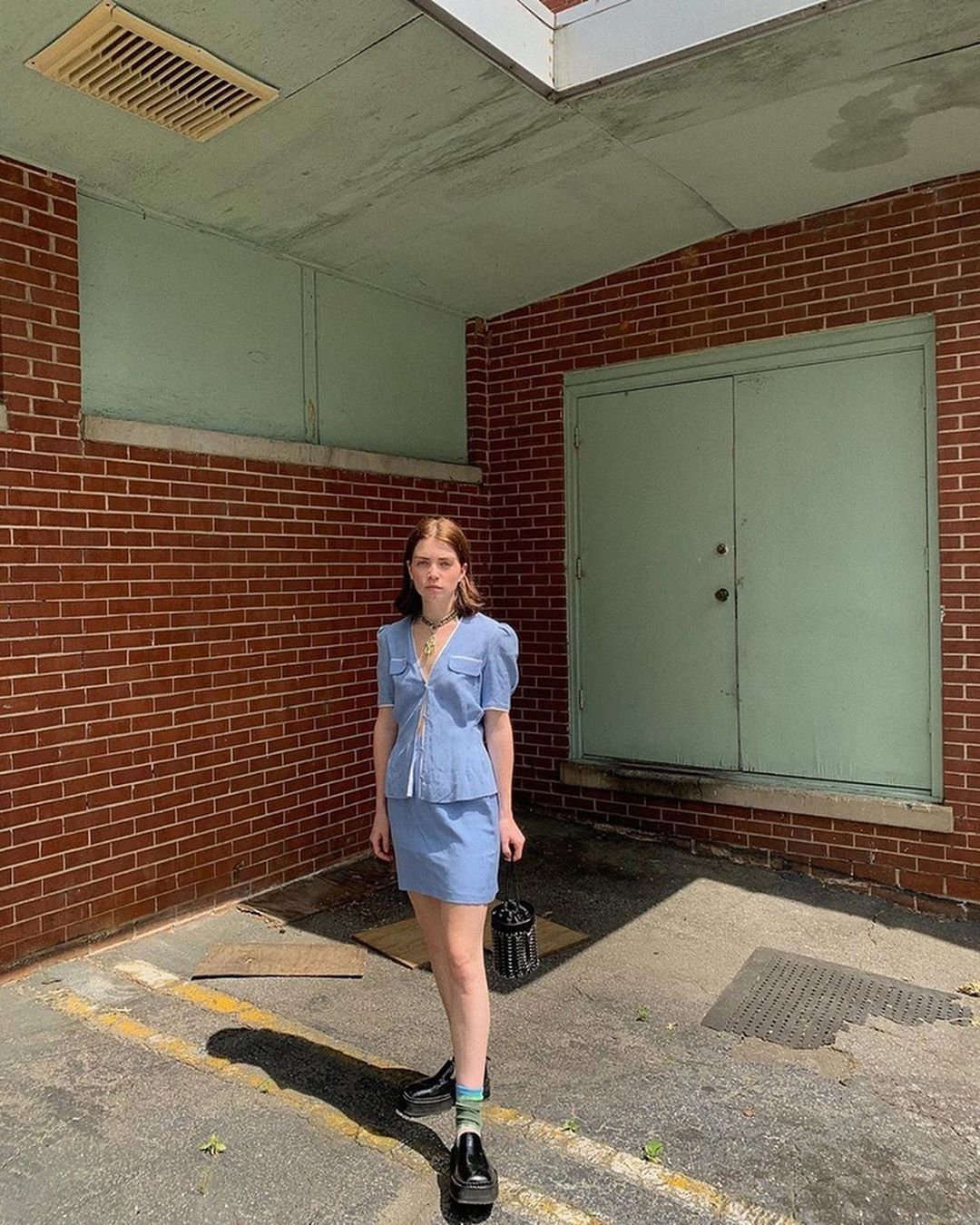 双子インフルエンサーのリース&モリー・ブルスタイン👭モリーはパステルカラーに黒小物をプラスすることでコーデをピリリと引き締め🖤2020AWのトレンドでもある黒バッグを取り入れれば、パステルコーデが秋まで楽しめそう🍂
