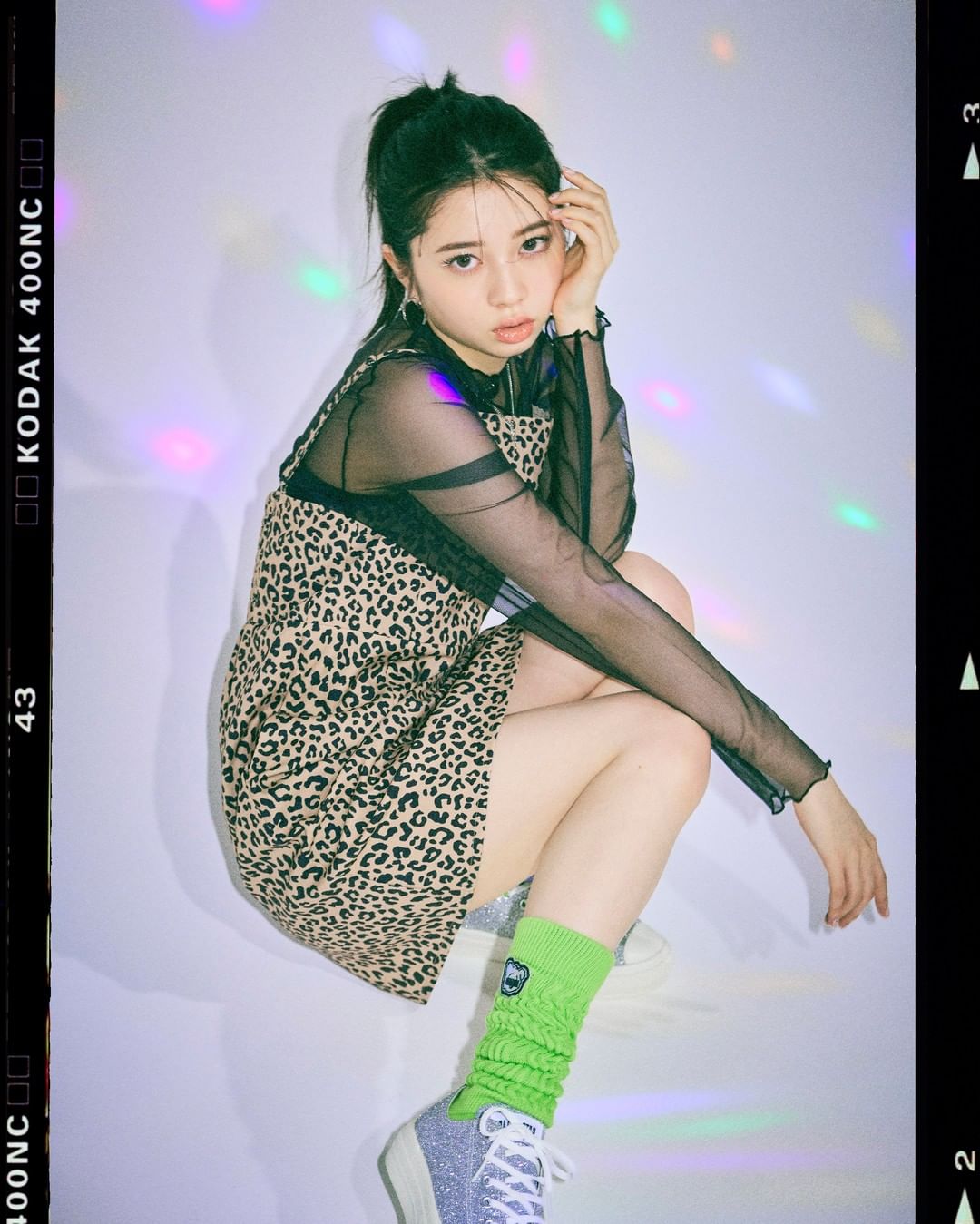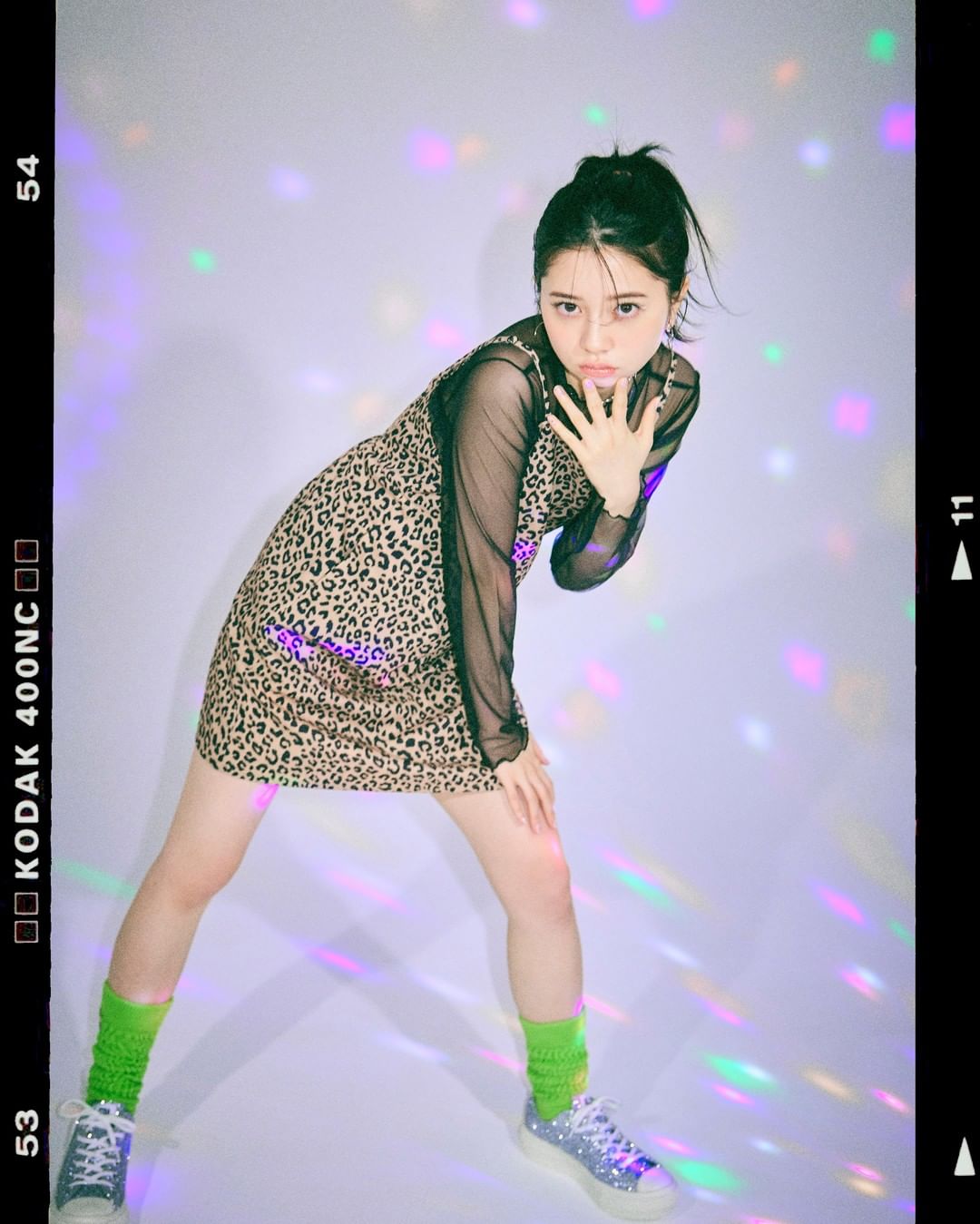 ルーズソックスはピンク色もあったけど甘くなりそうだったから黄緑にしてみた💚 芯の通った強いギャルをめざしたくて。アクセもあえてシンプルなシルバー系、ヒョウ柄を目立たせるために、トップスとアクセはコーデ全体からの引き算を心がけたよ💖」(ひより)