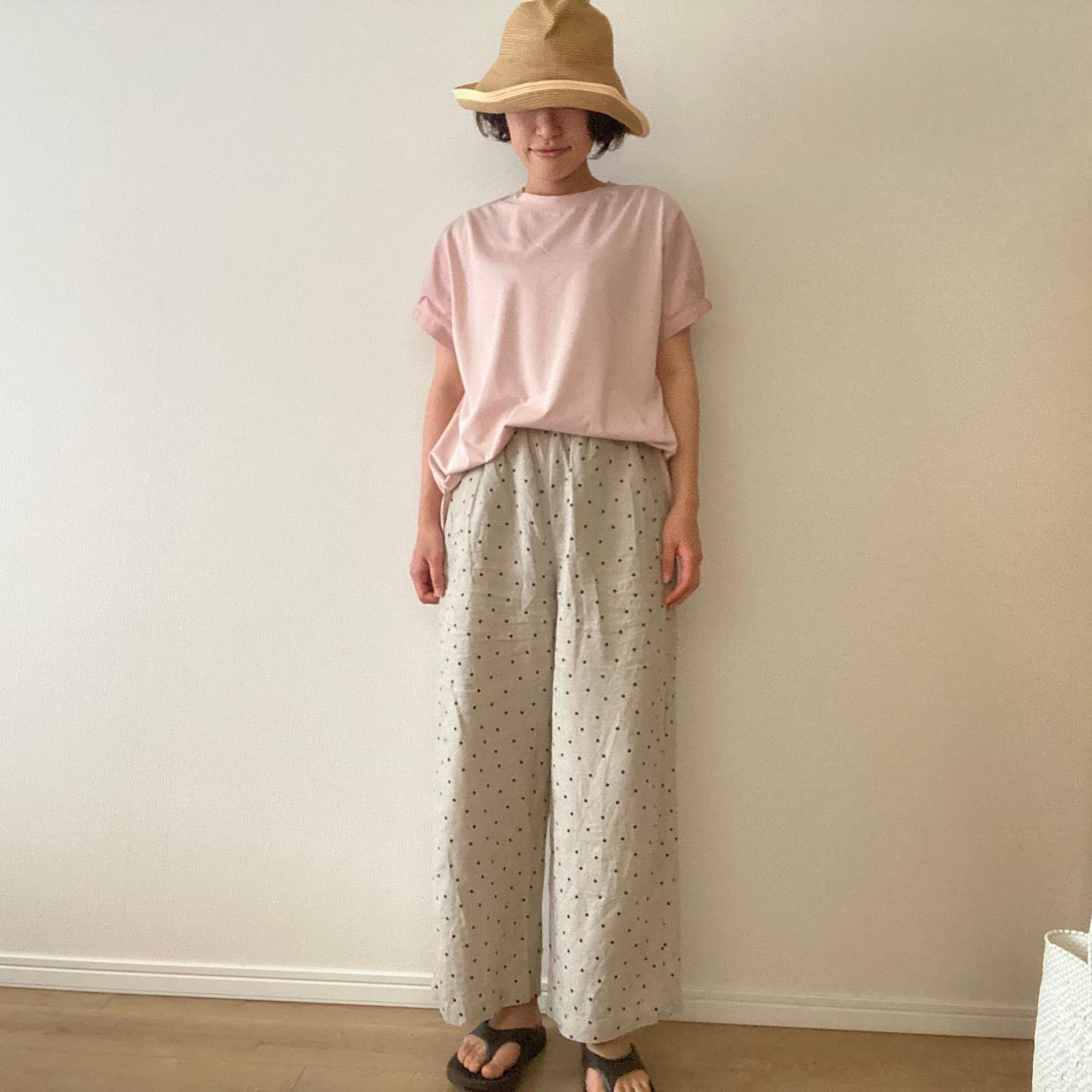 5・6枚目 ドットパンツとの休日コーデ。ワイドパンツのときは、シャツをインにして。前は伸縮性のあるカットソー素材、後ろはさらっとした布帛素材。