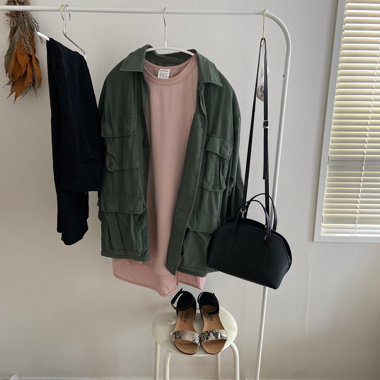 3・4枚目 ダスティピンク✖️カーキの休日コーデ。カーキがピンクの甘さを引き締めて大人っぼく。