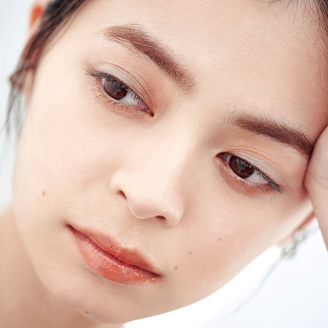 「グリーンは柔らかなくすみニュアンスを選び、アイシャドウ&マスカラでさりげなく投入。彩度高めのオレンジシャドウを合わせても派手になりすぎず、大人もトライしやすい夏のカラーメイクに」。