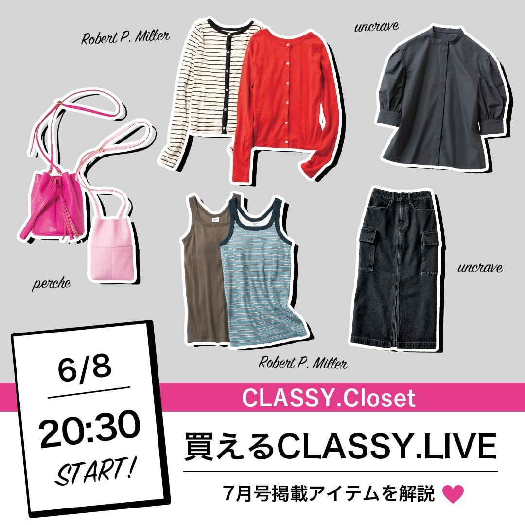 #classymagazine #classycloset #classyleaders #instalive #買えるCLASSY #classycloset #uncrave #アンクレイヴ #RobertPMiller #ロバートピーミラー #perche #ペルケ #ブラウス #シャツブラウス #ボリュームブラウス #デニムスカート #タイトスカート #スカート #カーディガン #ボーダーカーデ #タンクトップ #ブラトップ #ブラキャミ #インナーウェア #スマホバッグ #ミニバッグ #ピンクバッグ