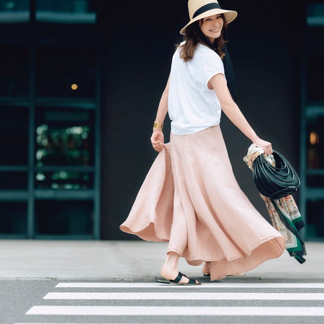 #ootd #今日のコーデ #大人カジュアル #スカート #フレアスカート #ピンクスカート #白T #ワンツーコーデ #2022夏 #夏コーデ