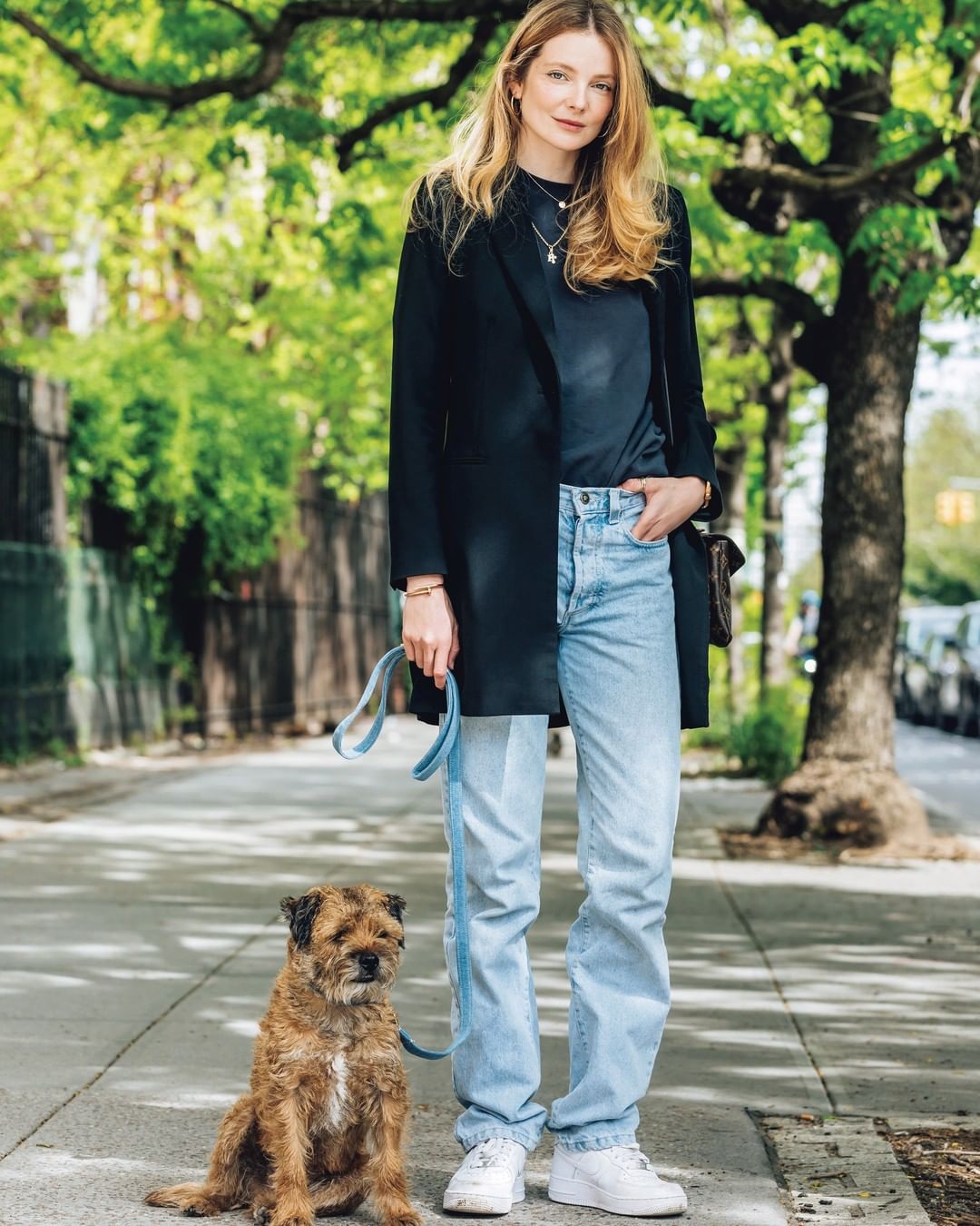 写真1枚目はNYのエニコ・ミハリクとチャーリー。ハンガリー出身のエニコはモデル歴20年のベテラン。「カジュアルかつエレガントなスタイルが好き」で、ヴィンテージショップで見つけたヴェルサーチェのデニムにザラのジャケットをオン。愛犬チャーリーのリードもデニムでマッチング。